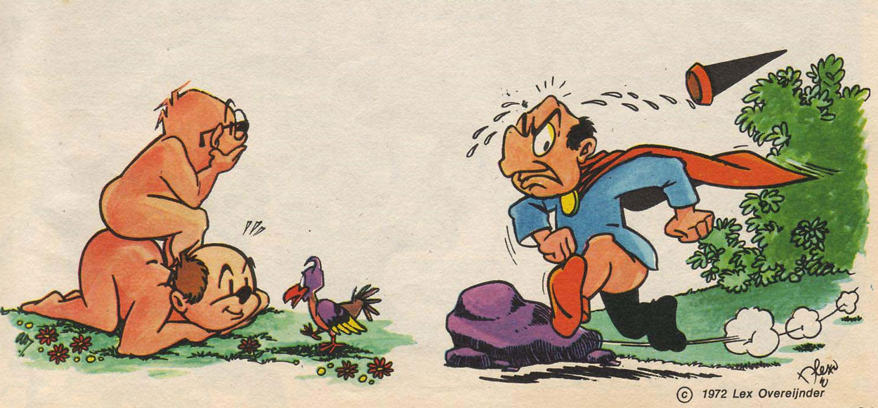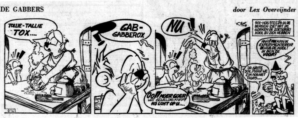 By working on 'De Fabeltjeskrant' comics, Overeijnder had the opportunity to drop his advertising work and focus on comics again. On 3 October 1970, he launched 'De Gabbers' (1970-1974) in De Telegraaf, a newspaper balloon strip about peculiar creatures who live in a valley surrounded by steep mountains, dark woods and a large lake. The only female is Moer Goer, who makes new Gabbers from a special kind of cabbage. The crop catches the attention of the group's enemies, including the red wizard Sov and his bone idle Gork folk. On 23 March 1974, after 1039 episodes, 'De Gabbers' came to an end. By then, Overeijnder had approached several broadcasting organizations for a possible TV adaptation. None were interested, but NCRV kept the door open if he would pitch a good idea.
