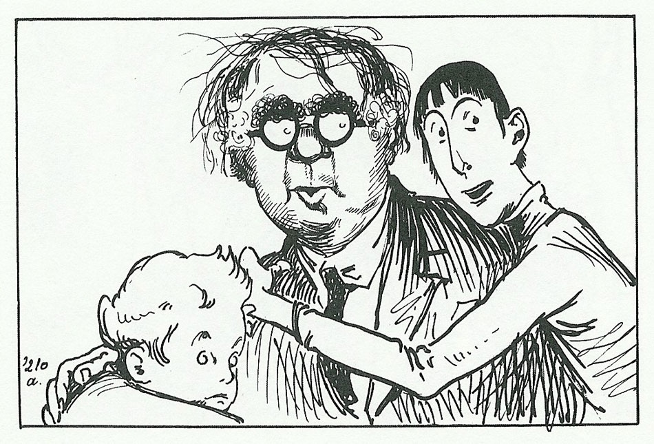 Drawing of A.M. de Jong with the characters Bulletje and Boonestaak by George van Raemdonck.
