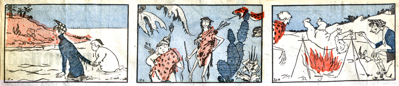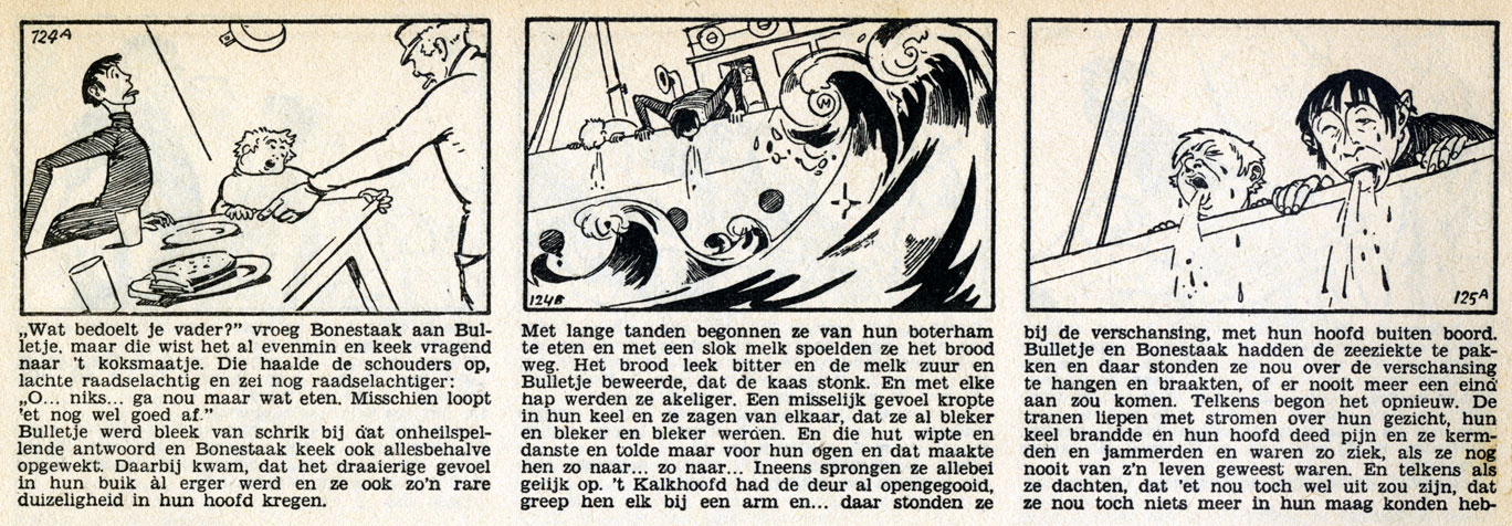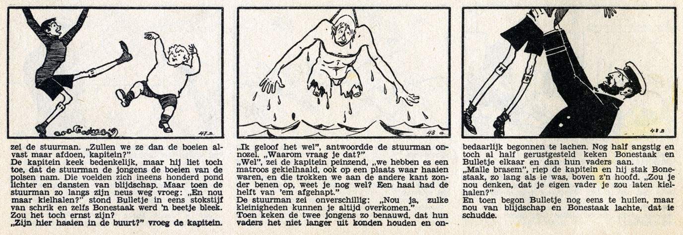 Indeed, 'Bulletje en Boonestaak' was a very subversive comic for the times. Several scenes taunted censors. In one narrative, for instance, the boys get seasick and throw up. In most illustrated stories at the time such action wouldn't be visualized, or at least merely suggested by showing characters discretely from the back. Van Raemdonck, however, shows their vomiting faces in full, disgusting view. Bulletje and Boonestaak are sometimes shown in the nude too, with their genitals exposed in a matter-of-fact fashion. Other imagery in the series could be quite gruesome and violent. In one scene, Bulletje imagines himself being roasted above a fire by cannibals. When his father tells him a keelhauled sailor once had his legs bit off by a shark, this is shown in bloody detail. Another narrative features a surreal head transplant. In one of his tall tales, Ouwe Hein tells how his ship was once attacked by buccaneers. To defend himself, Hein takes a large knife and engages in a fight with the robber chieftain, who is armed with a sword. They strike each other at the same moment, after which heads fly through the air and coincidentally change places accurately. Thanks to the tropical heat, the heads quickly become attached to their new bodies. The men return home, but their wives do not want a man with the wrong body. A genius English doctor is willing to risk a head transplant. Van Raemdonck draws the man working with saws and soldering irons to perform the only head transplant in history so far.
