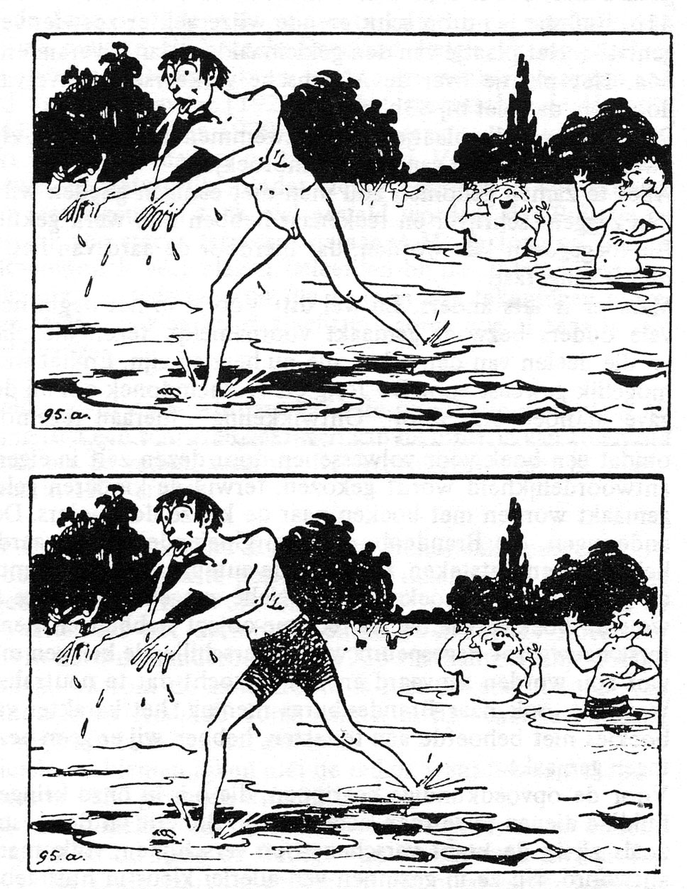 Past reprint editions of 'Bulletje en Boonestaak' often censored certain scenes. The boys giving a mutilated soldier money was cut in the 1928-1931 book edition by Van Nelle. A robber disguised as a vicar, Zwarte Jack, was suddenly rewritten to become a sheriff. When the stories were reprinted again in 1949-1959, censorship became even more rampant. After World War II, comics were seen in a negative light by parents, teachers and other moral guardians. Particularly in The Netherlands anything that wasn't family friendly had to be edited or cut. Scenes in which the boys were nude were altered. Their exposed genitals were covered with convenient black swimming shorts. Once again, the mutilated soldier scene was removed.