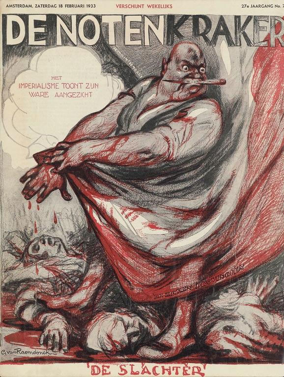 In 1919, A.M. De Jong was appointed editor of Internal Affairs at Het Volk, the daily evening newspaper of the Social Democratic Workers Party. That same year, he also became the editor of De Notenkraker, the leading socialist satirical weekly known for its political cartoons. Most likely instigated by De Jong, Van Raemdonck left De Amsterdammer in 1920 to join De Notenkraker as well. Van Raemdonck continued his activities as a political cartoonist until the magazine's final issue on 11 July 1936, making many timeless cartoons, characterized by their sharpness, honesty and engagement. Often self-explanatory, the drawings showcased the artist's contempt for and worries about Fascism, Nazism, war, poverty, unemployment, lack of rights and inhumanity. Several of his cartoons criticized Hitler and Mussolini. Some notably used a comic strip format. Among De Notenkraker's other graphic contributors at the time were Tjeerd Bottema, Albert Funke Küpper, Albert Hahn, Jr., Leendert Jordaan and Jan Rot.