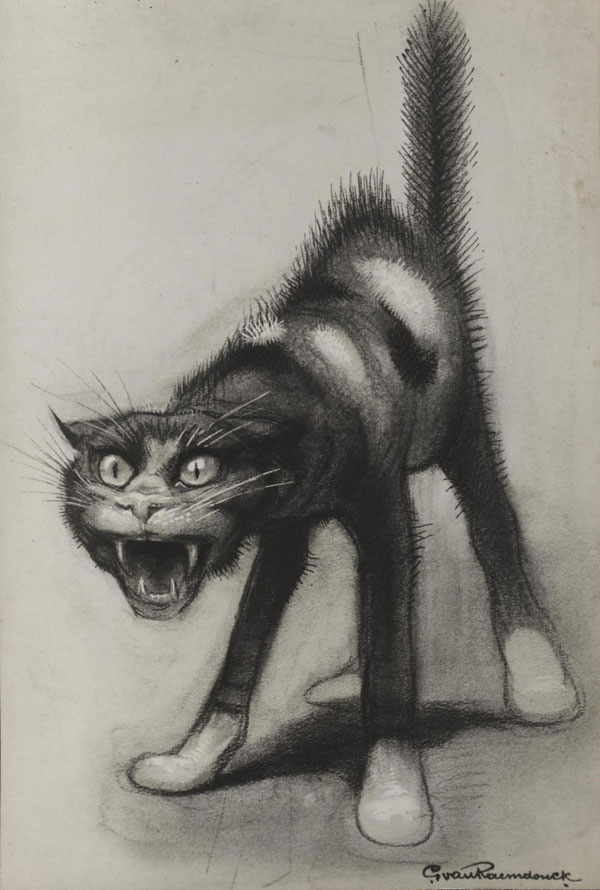 George Van Raemdonck was born in 1888 in Antwerp, Flanders. His father was a Dutch-speaking pharmacist and part-time painter. His French mother died when the boy was young, and George was largely raised by his grandmother. Van Raemdonck was a creative soul, showing a gift for both painting and music. He inherited his gift for drawing from his father, Joseph van Raemdonck. One of Van Raemdonck's 17th-century ancestors was an engraver in the days of Peter Paul Rubens. At age fifteen, George van Raemdonck enrolled at Antwerp's Royal Academy of Fine Arts, where he studied during 1903 to 1908. He continued his education at the Higher Institute of Fine Arts between 1908 and 1914, where the painter Franz Courtens taught him the finer points of landscape painting. In 1909, he moved to Zwijndrecht, a town in the periphery of Antwerp, where he lived the bohemian life. In 1913, Van Raemdonck's talent was recognized by the Royal Academy with the Nicaise De Keyserprijs. In addition to fine arts, Van Raemdonck also studied violin at the Conservatory. As a student, Van Raemdonck made illustrations for the weekly magazine Lange Wapper and several folksy novels.