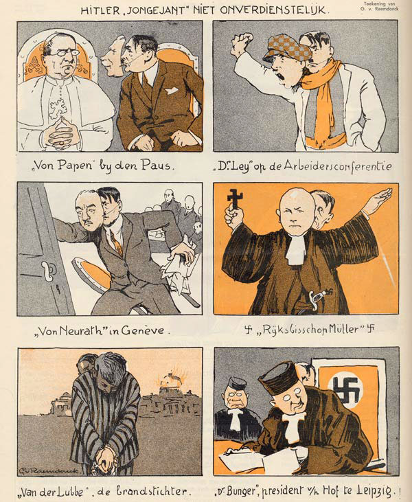 Satirical picture story from 1933 spoofing Adolf Hitler (De Notenkraker, 1933). Hitler is depicted as the man holding the strings behind several people who claim to operate alone, namely German vice-chancellor Franz von Papen, German Labor Front party leader Robert Ley, Foreign Minister Konstantin von Neurath, National Bishop Ludwig Müller, pyromaniac Marinus van der Lubbe (who set the Reichstag on fire in 1933, which many people believe was actually instigated by the Nazis as an excuse to start persecutions) and Wilhelm Bünger, judge of the Supreme Court.
