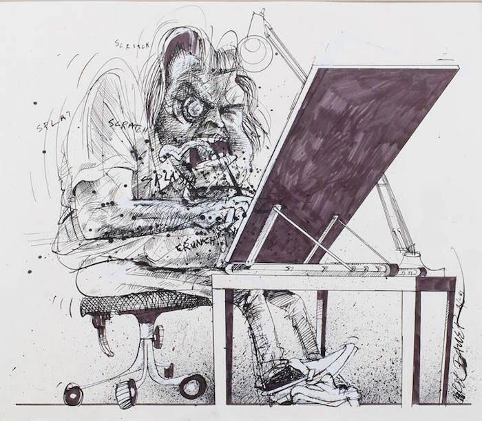 Derek Bauer was born in 1955 in East London, South Africa. He admired the work of cartoonists Gerald Scarfe and Ralph Steadman, but also more classic artists like Francisco de Goya and George Grosz. After graduating as a graphic designer at East London Technicon, he worked as a lay-out artist, renderer and eventually art director for De Villiers and Schonfeld, today known as Young and Rubicam. He eventually left the field of advertising and design and focused on drawing.