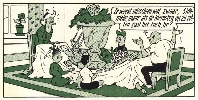In addition, Boumans did the finished artwork for the gag comics 'De Familie Snoek' (in De Standaard) and ''t Prinske' (launched in Tintin/Kuifje in 1953), as well as the humor features for the newspaper supplement Ons Volkske: 'De Vrolijke Bengels', 'Het Plezante Circus' (1954-1958) and 'De Lustige Zwervers' (1958-1960). In the mid-1950s, Boumans received the honor of taking over the 'Suske en Wiske' spin-off comic 'De Grappen van Lambik', which ran in the Catholic magazine De Bond. The gags also appeared in French as 'Les Farces de Monsieur Lambique'. Between 1958 and 1959 he assisted Vandersteen on the advertising comic 'De Familie Vergaren', promoting Centra supermarkets. The stories revolve around a family who successfully saves money by shopping at the chain. The series also appeared in French as 'La Famille Tirelire'.
