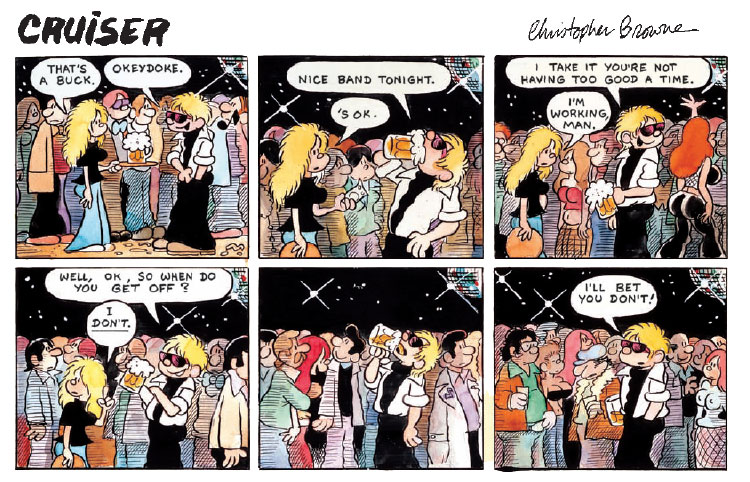 In Playboy, Browne made several contributions to the 'Playboy Funnies' section. Among the earliest gag strips he contributed was 'The Kinky Report' (September 1977), which mocked sexuologists. The title was a pun on the 'Kinsey Reports' sexual behavior books. In a February 1978 gag, a character named Cruiser was introduced, who'd receive his own long-running spin-off comic, 'Cruiser' in that same issue. The youngster in the shady glasses who try go get lucky with several women over the course of the series, but to little avail. Browne based the character on a roommate who was equally unlucky in seducing women. Browne also drew more irregularly appearing gag comics, like the unsuccessful stand-up comedian 'Benny Juice' (January 1979), the expy of 19th-century painter Henri de Toulouse-Lautrec 'Born Toulous' (February 1979) and talkshow host 'Tom Morrow' (June 1979).