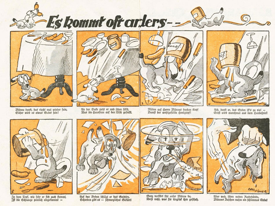 Carl Ernst Fischer was born in 1900 in the Bornheim district of Frankfurt, where he lived his entire life. After attending the School of Applied Arts, he began his career in the early 1920s working as a commercial artist. From the mid-1920s on, he contributed artwork to several illustrated magazines, for instance Fliegende Blätter and Lustige Blätter. During the late 1920s and early 1930s, Fischer also appeared as an illustrator and picture story artist in children's magazines, for instance Hans Kunterbunt and Die Blauband-Woche, the magazine of the German margarine brand Rama (its main artist was Emmerich Hüber). In the pages of Hans Kunterbunt, Fischer created the penguin Ping (1932), who reappeared in 1950 in his own picture book.