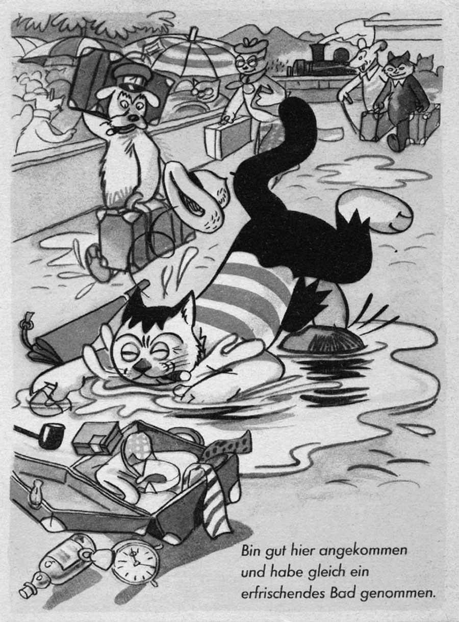 Dressed in a red-and-white striped sweater, Oskar is the head of a family of cats, whose everyday and all-too-human adventures gave a good impression of family life in post-War Germany. Together with his wife, only referred to as "Mommy", Oskar has five children - three boys and two girls - who are constantly trying to play pranks. The family wages a petty war against grumpy neighbors and unwanted visitors. Seven stories were collected in book format by the Frankfurter Societäts-Druckerei, with a total print run of 550,000 copies, and the artist received fan mail from all over the world, including Ecuador, Japan and Iran. The character became so popular that the feature also spawned dolls, games and paint books for children.