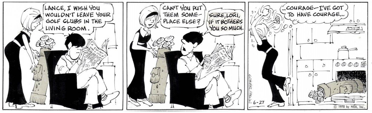 Paul Coker also had a career outside Mad. 'Lancelot' (Newspaper Enterprise Association, 1970-1972), scripted by Frank "Penn" Ridgeway under the pseudonym "Penn", was a gag-a-day newspaper comic. Syndicated by the Newspaper Enterprise Association, it featured the antics of a lazy, utterly clueless husband, Lance, and his long-suffering wife Lori, who does all the hard work. The first episode debuted on 16 March 1970. The series was discontinued on 29 April 1972.
