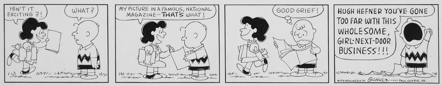 Paul Coker was born in 1929 in Lawrence, Kansas. He was about twelve when he published his first cartoon in the cartoon contest feature of the magazine The Open Road for Boys. He majored in drawing and painting at the University of Kansas. While he made illustrated contributions for the student paper, he preferred drawing advertisements, since these were better paid. Coker started off as a designer of greeting cards for Hallmark in the 1950s and 1960s, often in collaboration with writer Phil Hahn. He worked for Esquire, Good Housekeeping, Pageant, Look, McCall's and in 1957 became an editorial cartoonist for the New York Enquirer. Coker also contributed to Hugh Hefner's Playboy, where he created both erotic cartoons as well as parodies of other comics, like Charles M. Schulz' 'Peanuts'.