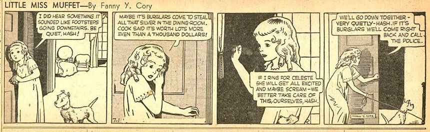 Between 2 September 1935 and 30 June 1956, Cory produced a second feature, the daily strip 'Little Miss Muffet', for King Features Syndicate. Running for 21 years as a direct competitor to Tribune Media's 'Little Orphan Annie' by Harold Gray, this strip featured the dramatic adventures of an orphan girl, named after a nursery rhyme character and modeled after Hollywood child star Shirley Temple. Between 1940 and 1946, the feature was written by Tecla Scheuring, although other King Features staff writers have presumably also contributed to the comic over the years. In 1948 and 1949, three issues of a 'Little Miss Muffet' comic book were published by Best Books, collecting stories from the newspaper strip.