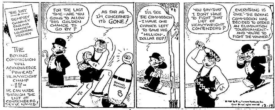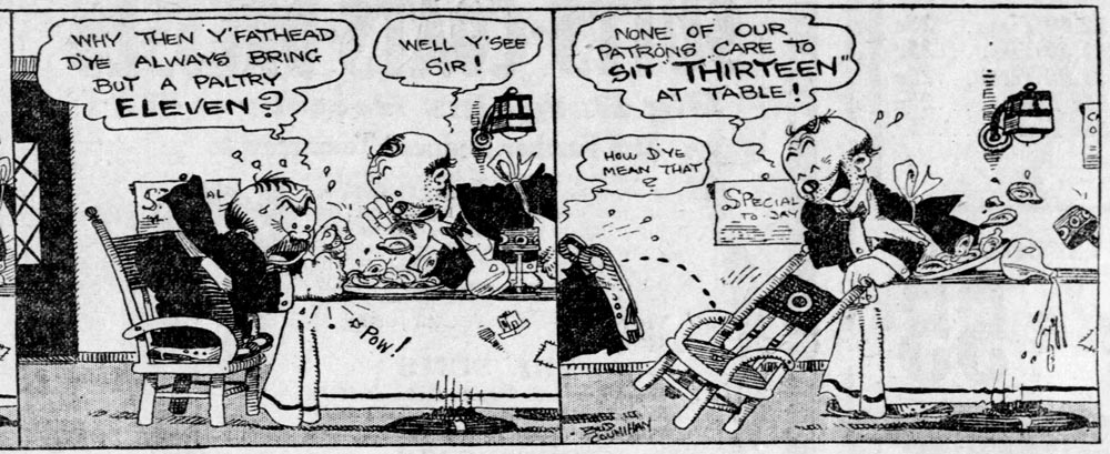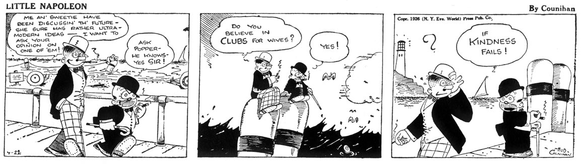 By 1916 Counihan presumably had enough work to do for the World, as his daily strip about the grumpy 'Henry Hasenpfeffer' had been launched on 16 January 1916. It showed a strong resemblance to the main character in his earlier strip 'Twas Ever Thus', both in visual appearance and in his tendency to fall over backwards in shock in the final panel of each strip. Counihan's subsequent strips all starred similar small cigar-chomping hotheads with bowler hats. 'The Big Little Family' lasted from 27 September 1917 to 23 June 1923, and was replaced by 'Little Napoleon' from 25 June 1923 to 16 April 1928. Counihan then left the New York World and tried his luck at King Features Syndicate with a daily serial strip about boxer 'Pinhead Dooley' (25 June 1928 - 4 May 1929). He also became one of Chic Young's assistants on 'Dumb Dora' (1929-1930) and the 'Blondie' Sunday pages (1930-1934).