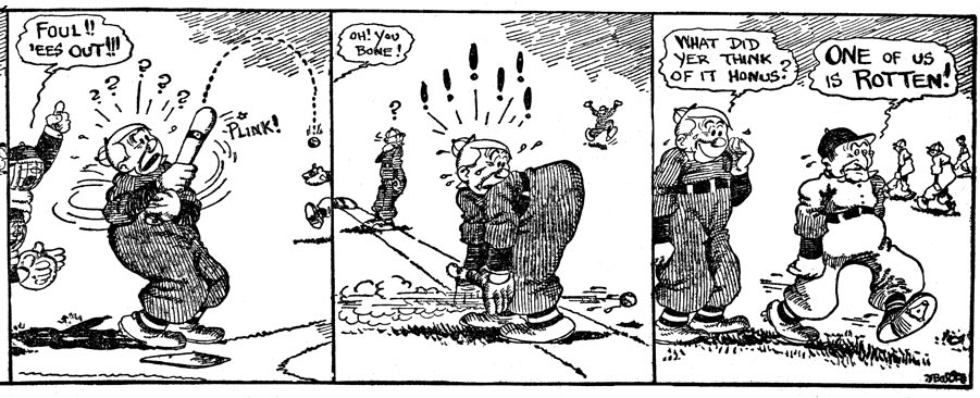 Counihan's early work for the World were weekday features like 'Did You Ever?' (21 August - 23 October 1914, signed Budsee) and 'Things You Never Forget' (15 April - 7 May 1915). With Ferd G. Long he alternated on 'Twas Ever Thus' (17 August - 21 September 1915), which ran alternatively as a mini-strip (at times about 1" tall) or as a regular strip, and was also known as 'Flicker Folly'. As part of the World's staff, Counihan was also assigned to draw 'General Information' comic strips as ads for Macy's Department Stores (July-September 1919). In addition to his work for the New York World, Counihan created the baseball strip 'Luke McGlook, The Bush League Bear Cat' (or 'Luke McGlook, The Brainy Bean Boy') for the World Color Printing syndicate, as "Budsee". Beginning on 15 May 1915, Counihan's run came to an end somewhere in 1916 when Carl Ed took over. Ed's 'Luke McGlook' ended on 28 October 1916, but remained in syndication during the 1920s and 1930s.