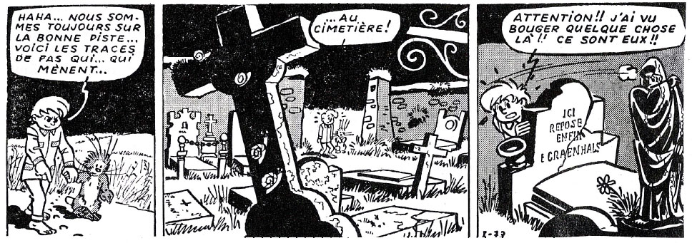 During the mid-1950s and early 1960s, Craenhals had a couple of excursions into other comic genres. In 1955, he made the short humorous story about the caveboy 'Yopy' for the Tintin Sélection pocket series, followed in 1956 by the slapstick short story 'Luc, Lucette et Fantoche' in Tintin issue #22. In 1958, Craenhals worked with writer René Goscinny on a two-page story with 'Alphonse', a humorous character previously drawn by Tibet. To further explore his talent for writing clever intrigues, Craenhals created the one-shot serial 'Aventure à Sarajevo' (1960), starring the gentleman secret agent Delta. Drawn in a semi-realistic style similar to 'Pom et Teddy', Lombard released the story in book format in its collection Jeune Europe.