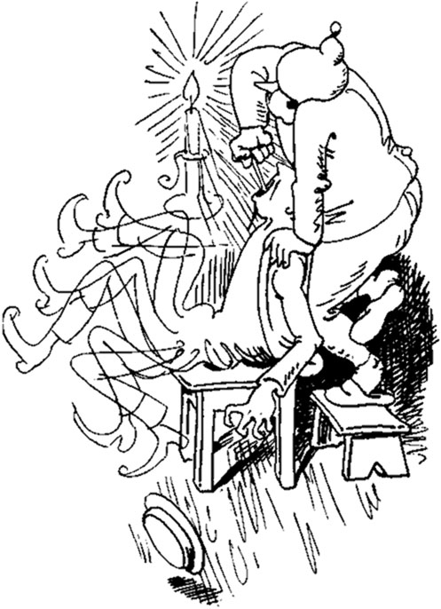 'Die Haarbeutel ('The Hair Bag', Bassermann, 1877) is a collection of picture stories poking fun at drunk people. Given that Busch was an alcoholic himself, they prove his gift for self-mockery and giving a first-hand visual experience of what liquor does to the brain. In the tale 'Der Undankbare' ("The Ungrateful") for instance, a drunk tries to find his way back home, while the background circles around him. In 'Die ängstliche Nacht' ("The Scary Night"), a man wakes up with a braincrushing hangover, turning his head into a watering can, while a tiny demon plays drums on it.