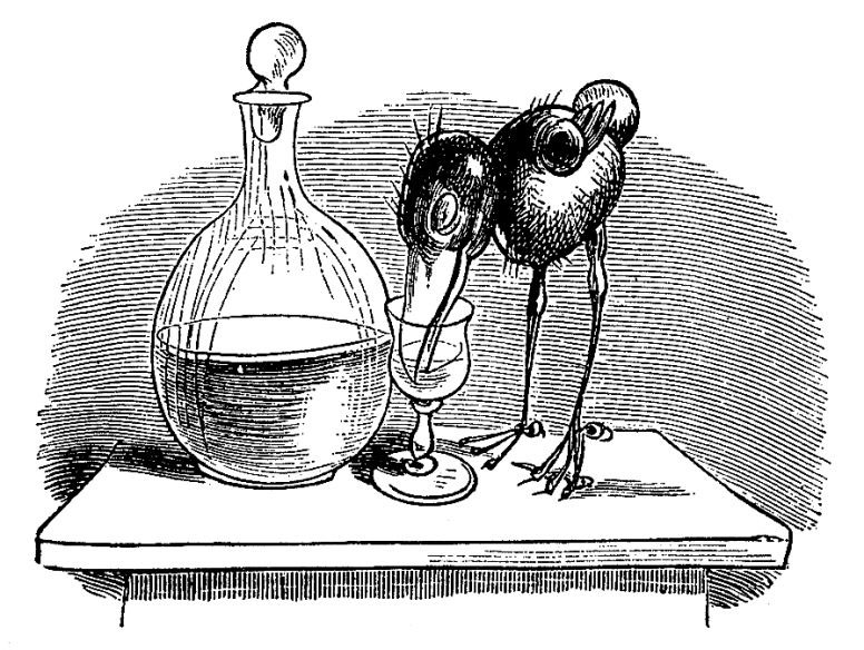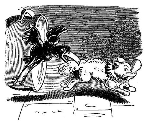 Another famous picture story by Wilhelm Busch, 'Hans Huckebein der Unglücksrabe', was serialized between October 1867 and September 1868 in the newspaper Über Land und Meer, which circulated in Stuttgart. The text comic centers on the raven Hans Huckebein, who is adopted by a boy named Fritz. The bird turns out to be a bad pet, biting people, stealing food and knocking over various household objects. The ill-mannered raven eventually drinks a glass of liquor, gets drunk and finds itself entangled in Fritz's aunt's knitting gear. The bird then accidentally strangles himself, dying a moralistic death. The story was inspired by Busch's brother from the town of Wolfenbüttel. He once told him that a gardener's pet raven had killed all the chicks on his farm by pecking the birds on their heads when they wanted to drink from the water bowl.