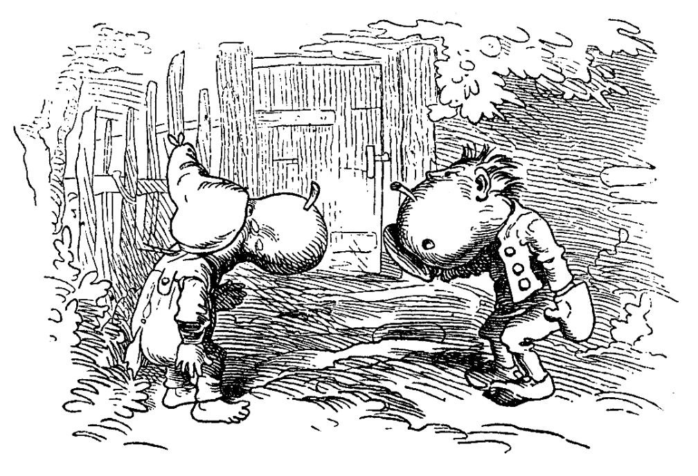 In their first story, Max and Moritz sprinkle crusts of bread for the chickens and rooster of widow Bolte, but attach them to a string. As the dumb birds gobble up the bread, they are suddenly attached to each other and get wired in a tree. Now all dead, Mrs. Bolte decides to roast the birds, but the mean boys pull the delicious food from the cauldron through the chimney by using a stringed hook. Their next victim is Böck the tailor. The little brats saw the legs of a wooden bridge in half and yell insults at Böck. When the angered draftsman rushes out, he crosses the bridge, which collapses and plummets him into the river. Since teachers are school boys' natural enemies, Max and Moritz also target their headmaster Lämpel. They break inside his house and stuff his pipe with gunpowder. When he lights it, it explodes, leaving him with severe burn wounds. Even the boy's own relatives aren't safe: they fill their uncle's bedroom with maybugs, giving him a long, sleepless night to crush all the invertebrate intruders. Max and Moritz' luck turns when they try to steal pretzels from a baker. They fall into a vat of dough, while the baker puts them in the oven. The devious juvenile delinquents eat themselves through the dough and escape. At farmer Mecke's barn, they cut holes in his bags of grain, until they are caught, brought to the mill and grinded flat (!), while ducks eat their remains. At this point, the little brats are so hated by the villagers that nobody cares that the miller basically just murdered two children. Instead everybody revels: "Gott sei Dank! Nun ist's vorbei mit der Übeltäterei" ("God be praised, now the evil has passed"), which has become a well-known line in German literature and everyday language.