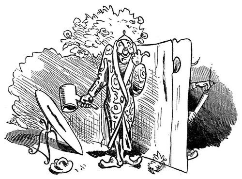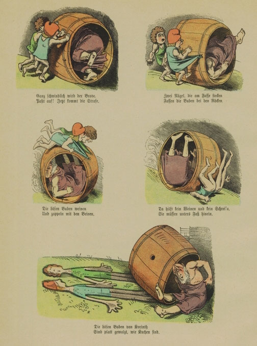 Marital troubles take center in 'Wie der Mann um den Hausschlüssel bitten lernt' ("How Man Learns How to Ask for the House Key", issue #874, 1862). A man beats his wife until she hands over the house keys. Yet his coat gets stuck between the door, leaving the pocket with his key in it inside. The woman is now in a position to force her husband to beg to retrieve it. In 'Der Lohn einer guten Tat' ("Reward for Good Behavior", issue #877, 1862), a man saves a boy from drowning, but is instead forced to pay the city council for his deed. The picture story is accompanied by the line "based on a true story”, leaving modern-day readers wondering whether Busch based it on a personal anecdote. Ancient Greek philosopher Diogenes is the protagonist in 'Diogenes und die bösen Buben von Korinth' ("Diogenes and the Mean Kids from Korinthe", issue #881, 1862), sleeping in his iconic barrel, when two brats bother him. He eventually gives them a dose of their own medicine by rolling his barrel over them, leaving them flat. This may be the first instance in a comic strip where characters are comically flattened like gingerbread men.