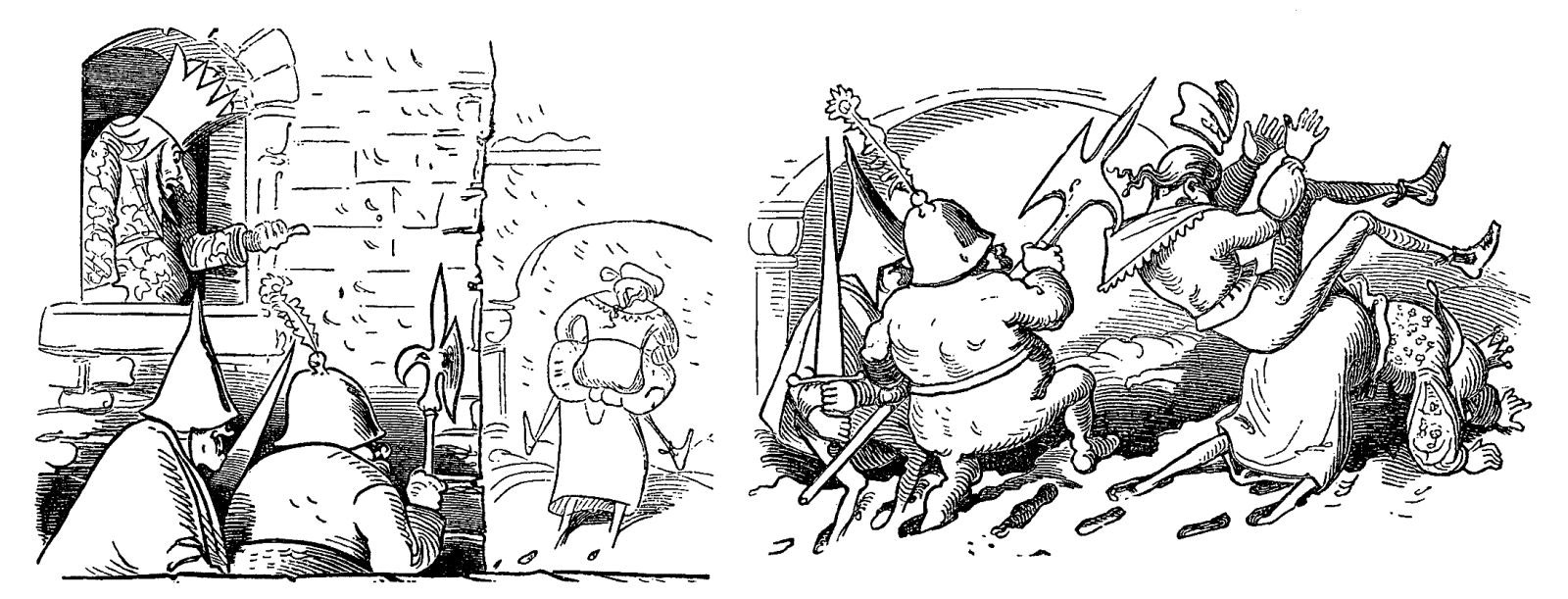 'Eginhard und Emma' was featured in a carnival-themed edition of Die Fliegende Blätter, issue #970. Based on the medieval chivalric romance of the same name, Busch moves the action to his own era. Emperor Charlemagne has a daughter, Emma, who is lovingly abducted by her lover, Eginhard. They are caught, brought back to the emperor, who eventually gives them his blessing. The picture story has some political subtext. Eginhard is reminiscent of Ludwig II, emperor of Bayern, while Charlemagne's servant Frederik is a caricature of Frederick the Great. The work pokes fun at the mythology surrounding the Holy Roman Empire, already promoted by German nationalists when Busch was alive. Here, none of the royal splendor is present. Charlemagne lives in a simple house and is depicted as a rheumatic old man, using a chamber pot at night and wearing clogs. 'Eginhard und Emma' also satirizes Catholicism and governmental bureaucracy.