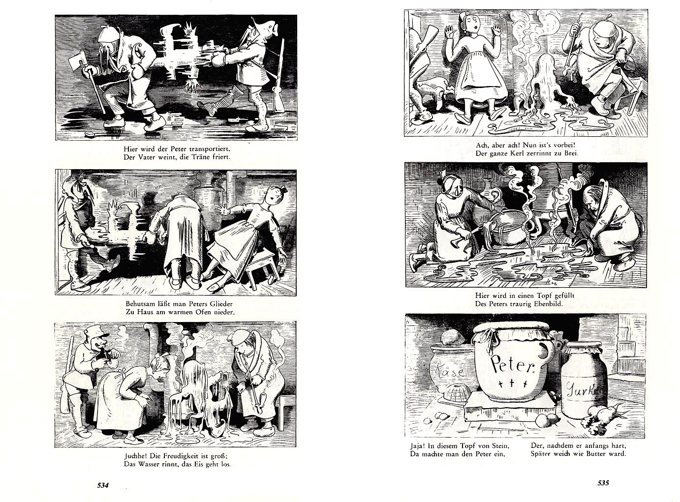 Unfortunately, Richter's hunch turned out to be correct, as 'Bilderpossen' didn't sell. Readers didn't know whether it was intended for children or adults. Particularly 'Eispeter' was considered too horrific, on the level of Heinrich Hoffmann's similarly nightmarish "educational" 1845 picture book 'Der Struwwelpeter'. In 1960-1961, when 'Bilderpossen' was reprinted in East Germany, 'Eispeter' was completely omitted.