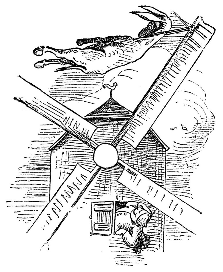Most of Busch's picture stories for the Münchener Bilderbogen were one-shots. In only a couple of stories he used recurring characters. An unnamed farmer and his animals are the protagonists in three successive picture stories. However, only his profession shows any continuity. His physical appearance differs in each tale, suggesting he is not the same character. In 'Der Bauer und der Müller' ("The Farmer and the Miller", sheets #300-301, 1861), the farmer ties his mule to a windmill. The miller puts the mill into motion, sending the animal into a spin, eventually killing him. The disgruntled farmer takes the carcass home, gets into an argument with his wife and takes revenge on the miller by sawing the entire windmill down. Busch returned to farmer antics with 'Der Bauer und sein Schwein' ("The Farmer and his Pig", sheets #316-317, 1862), in which a farmer takes his pig to a tavern, where the swine thrashes the place until he's captured and slaughtered. The final farmer story is 'Der Bauer und das Kalb' ("The Farmer and the Calf", sheet #342, 1863), where he tries to lead a stubborn calf to the city. The animal, however, doesn't want to come along. Eventually, the farmer ties a bell around the beast's neck "so he'll think he's a cow". Amazingly, the ploy works.