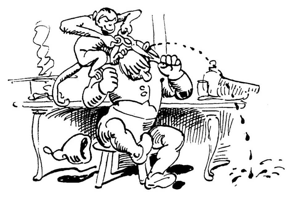 In 1879, Busch released 'Fipps, Der Affe' ("Fipps, The Monkey", Bassermann, 1879), a picture story about a mischievous African monkey brought to Bremen by a hunter named Schmitt. He sells the animal to the barber Krüll, but Fipps wounds the ear of one of Krüll's customers, farmer Dümmel. The simian then smashes a hand mirror on Krüll's head and flees the store. Outside, Fipps continues to cause mayhem until he is caught and adopted by a doctor, Mr. Fink, his housekeeper Jette and baby daughter Elise. At first, the family dog Gripps and cat Schnipps distrust the new pet, but eventually grow to like him. Still, after too much monkey business, Fipps is thrown out. He only manages to redeem himself when he saves little Elise from a house fire. Nevertheless, Fipps can't help himself: during one of his strolls, he steals a loaf of bread from a farmer's boy, who happens to be the son of farmer Dümmel, whom he had wounded earlier in the barber shop. Dümmel then shoots Fipps to death. Everybody whom the monkey bothered earlier witnesses his death and Fipps is buried, ending his tale on a sad note.