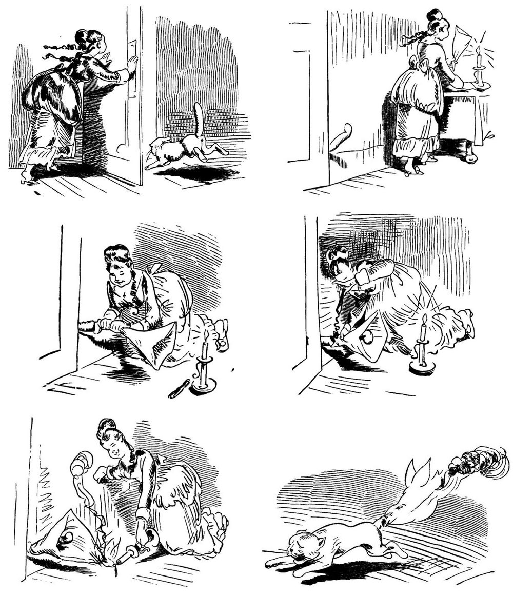 Between 1859 and 1871, Busch made several one-shot picture stories for the magazine Fliegende Blätter. In the two-panel picture story 'Übertriebene Gefälligkeit' ("Excessive Complacency", issue #744, 1859), a man's hat is blown away by the wind, but captured by a farmer on his scythe. His next tale, 'Wie die Kränzl-Bötin die ganze Woch mit ihrem kranken Maxl geplagt ist' ("How Kränzl's Teacher is Bothered by Maxl's Illness Throughout the Week", issue #763, 1860), visualizes various excuses why little Max was too ill or physically unfit to attend school that week: he was doing hard labor at home, leaving him exhausted. Although not really a story, the images are a chronological progression of thematically connected images. The pantomime comic 'Die Maus oder Die gestörte Nachtruhe' ("The Mouse, or the Disturbed Night Rest", issue #783, 1860) provides a genuine humorous narrative. In this comic, a couple hears a mouse and tries to capture the nasty little critter. But in the final panel, he's still at large, making a taunting gesture at them.