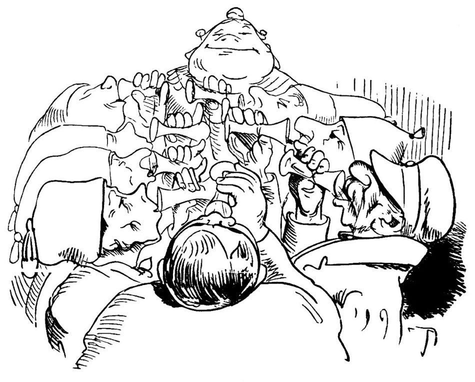 Still in 1872, Busch also released 'Bilder zur Jobsiade' ('Pictures of the Jobsiad'), an adaptation of the 'Jobsiad' (1783-1784), a story written by Carl Arnold Kortum, but bowdlerized and partially rewritten by Busch's publisher Otto Friedrich Bassermann. The story centers on an unlucky man who finds himself in various jobs and situations, without ever finding lasting happiness. Busch was originally commissioned to just illustrate the text, leaving him with little creative possibilities. Only when his publisher rewrote the manuscript in collaboration with Busch, did the work appeal more to him. The 'Jobsiade' is interesting for comic historians, particularly the scene in which the protagonist is questioned by a group of judges. They shake their wig-decorated heads in unison, each time they disagree with our hero's replies. Busch gives the scene a tremendous feel of motion and consecutive sequences. In another image, where somebody blows a horn, Busch places the onomatopoeia "Tu-nuth!" between two straight lines that emerge from the instrument, an early example of sound mimicry within a picture story panel.