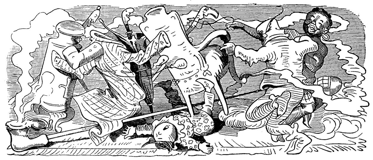 Since publisher Braun had a workshop for wood engraving, all of Busch's early picture stories were made with this technique. From 1876 on, his illustrations were photographed and transferred onto a photosensitive zinc plate, the 'Herr und Frau Knopp' story being his first to use this technique. Visually oriented, Busch typically drew first, so he could focus on the narration afterwards. Contrary to many other prototypical comic artists of his time, his texts weren't a mere afterthought. He gave his narration equal care and attention, using sophisticated words, with dry, ironic reflections on the mayhem depicted in his panels. Making matters more complicated, he also wrote everything in rhyming couplets. Another novelty was Busch's use of onomatopoeia. He often implies sound effects with self-invented words, a standard in many comics today. Yet Busch restricted them solely to the text captions underneath the images. Only in one story, 'Bilder zur Jobsiade' ('Pictures of the Jobsiad', Bassermann, 1872), a sound effect appears within an image, namely a trumpeter blowing the sound "Tu-nuth!". Busch's use of language offered a powerful suggestion that comics could, indeed, be both equally visually and verbally strong.