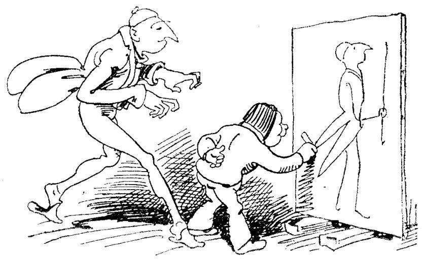 With 'Zwei Diebe' ("Two Thieves", sheet #427-428, 1866), Busch drew a more serious picture story about two burglars who try to rob a privateer and his wife, but eventually receive their retribution when they escape through the window and are pierced by the umbrellas they used to soften their fall. The scenes in which the criminals rob the couple are disturbing and genuinely menacing. 'Der neidische Handwerksbursch' ("The Jealous Craftsman", sheet #436, 1867) contrast the life of a poor, starved craftsman and an obese man who enjoys three meals in a restaurant. While the corpulent restaurant customer appears to be the lucky one, the craftsman is at least free to roam the Earth, while the obese man is revealed to have problems of his own, namely a bandaged leg. Busch provided his own adaptation of Wolfgang Amadeus Mozart's comical opera 'Die Entführung aus dem Serail' ("The Abduction from the Seraglio", sheet #439, 1867), in which a handsome knight saves a young woman from the sultan's harem.