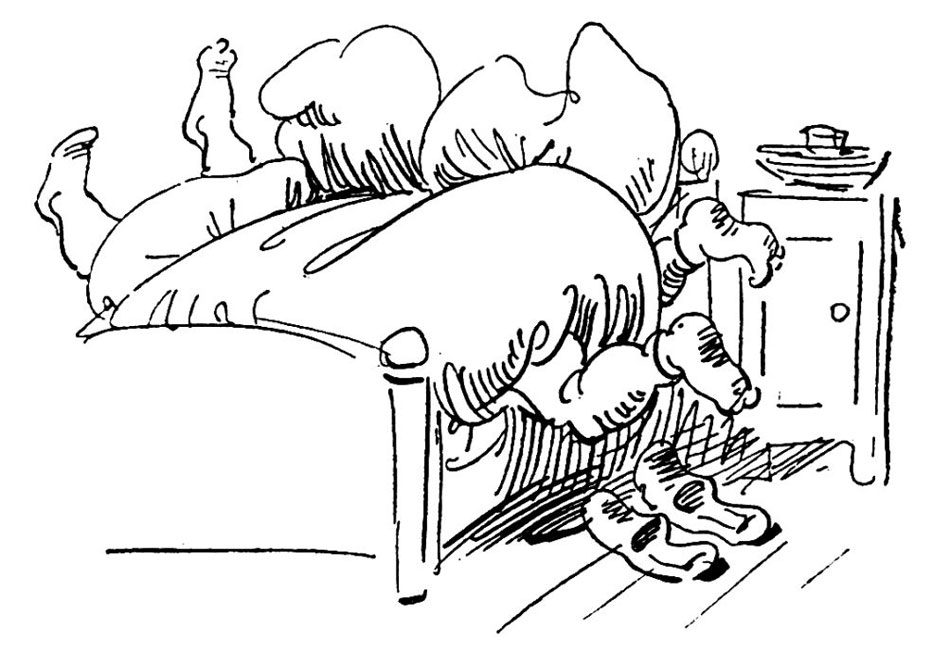 Biographers regard 'Tobias Knopp' as a reflection on Busch's own bachelor life. He never had stable relationships, and eventually decided to stay single for the rest of his life. 'Tobias Knopp' reflects how having a partner and a family isn't always a bed of roses. Interestingly enough for such a nihilistic reflection on married life, 'Tobias Knopp' is also notable for featuring an implied sex scene. In the chapter 'Eheliche und Ergötzlichen' ("Marital joys"), Tobias and Dorette make out under the sheets. Although no nudity is seen, their pillows and sheets are in motion, with their legs sticking out in silly positions, leaving little to the imagination. The low-brow comedy continues when Busch depicts human faces in the folds of Tobias' behind. These scenes didn't prevent Wolfgang Liebeneiner from adapting 'Tobias Knopp' into a 1950 animated feature, the first of its kind in post-war Germany.