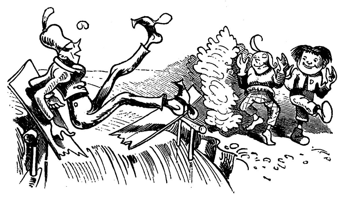 More public embarrassment occurs in 'Ein galantes Abenteuer' ("A Gentle Adventure", issue #1102, 1866), where a gentleman tries to be nice to five cleaning ladies, who misunderstand his good intentions, clobber him with their brooms and then steal the pennies he throws on the ground to distract them. 'Der vergebliche Versuch' ("The Vain Attempt", issue #1121, 1867) differs from most of Busch's other picture stories in the sense that the only narration appears at the start of the tale, as a kind of introduction. The rest of the images form a pantomime comic mocking a drunkard who wants to light his cigar to a candle, but accidentally sets his nose on fire. A pure pantomime comic is 'Das gestörte Rendezvous' ("The Disturbed Rendezvous", issue #1160, 1867), in which a lover uses a huge basket on a string to climb to his girlfriend's balcony, which she pulls up. Her angry father interferes, but after several shenanigans he ends up being more bruised and embarrassed than them. 'Der Katzenjammer am Neujahrsmorgen' ("The New Year's Morning Hangover", issue #1174, 1868) is an accurate visualization of what a hangover feels like. Busch uses interesting imagery to imply the headache, like black bubbles and a little devil spinning a wheel next to the protagonist's head. The title may also have inspired Rudolph Dirks in 1897 to the title of his Busch-esque newspaper comic 'Der Katzenjammer Kids'.