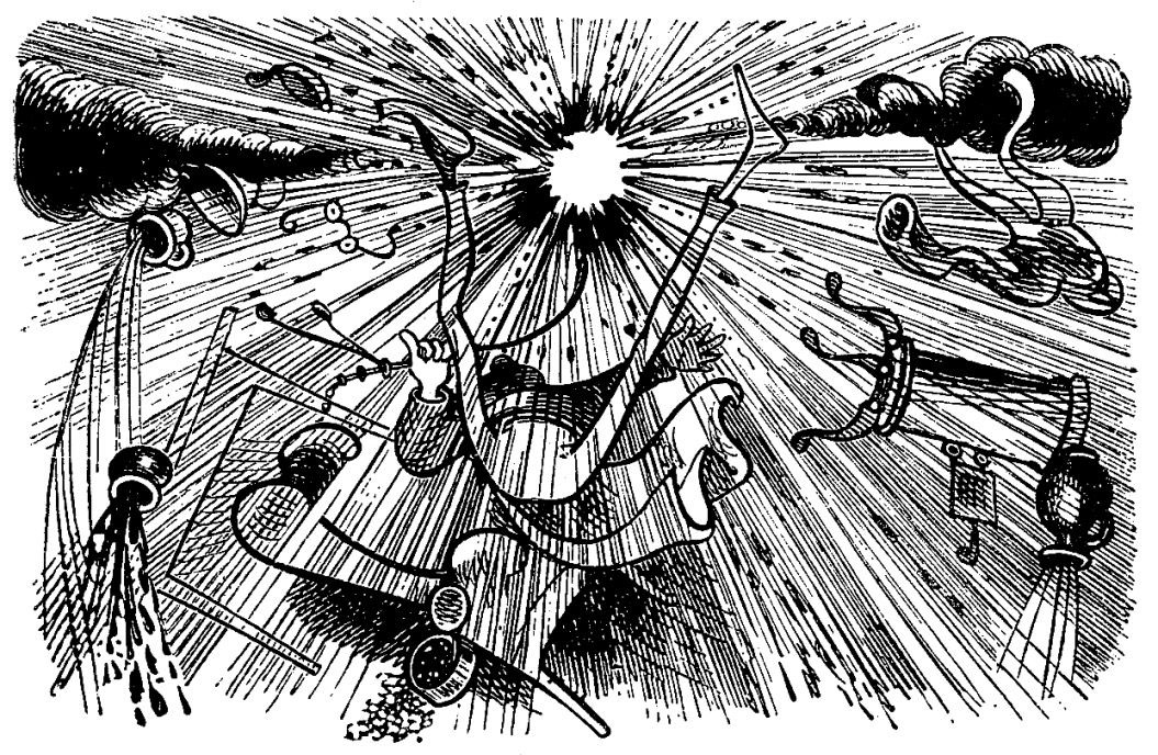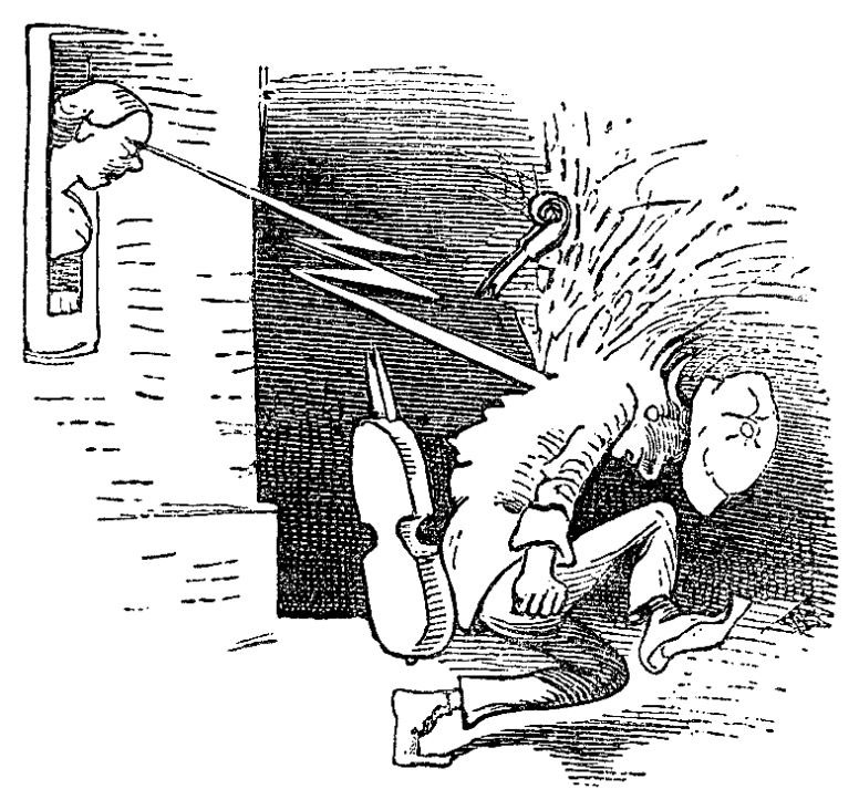 'Max und Moritz' takes a significant place in the history of comics. It's a perfect combination of text and imagery, built around two strong, colorful characters and well-staged gags. Busch uses self-invented onomatopoeia, including "Schupdiwup" (to imply a fishing rod hailing in a fried chicken), "Knusper Knasper" (when the boys bite through a bread crust), "Ritzeratze" (for the breaking bridge) and "Rickeracke" (when the mill grinds). While the onomatopoeia aren't included in the illustrations yet, they do appear in the accompanying text. Several scenes are very reminiscent of classic comic strip gags, like the exploding pipe which leaves the victim with a black, ash-burned face.