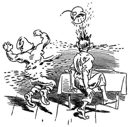 A mean youngster takes a ride on a donkey in 'Vetter Franz auf dem Esel' ("Cousin Franz on a Donkey", sheet #472, 1868), but the animal drives off with him, trashing him against a group of dining people. The fairy tale 'Die Verwandlung' ("The Metamorphosis", sheet #474, 1868) stars a gluttonous boy, Karl, being lured off by a witch, who captures him with a sausage on a fishing rod and then transforms him into a pig. Just when she and her husband will devour him, Karl's sister Ännchen comes to the rescue carrying a magical flower. The witch's husband is burned alive, while his knife accidentally kills her. All ends well when Ännchen transforms Karl back to a human. Good also triumphs over evil in 'Schmied und Teufel' ("Blacksmith and Devil", sheet #455, 1869), where a blacksmith outsmarts the Devil. A well-staged farce by Busch is 'Die Brille' ("The Glasses", sheet #527-528, 1870), where a man refuses to eat his soup after discovering a hair in it. Instead, he wants to drink rum, but his wife snatches the bottle away. A fight erupts, in which she steals his glasses, leaving him unable to see what he's bumping into. Eventually he gives in and the couple make up, while their dog has already gobbled up the rest of their evening meal.