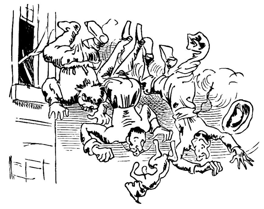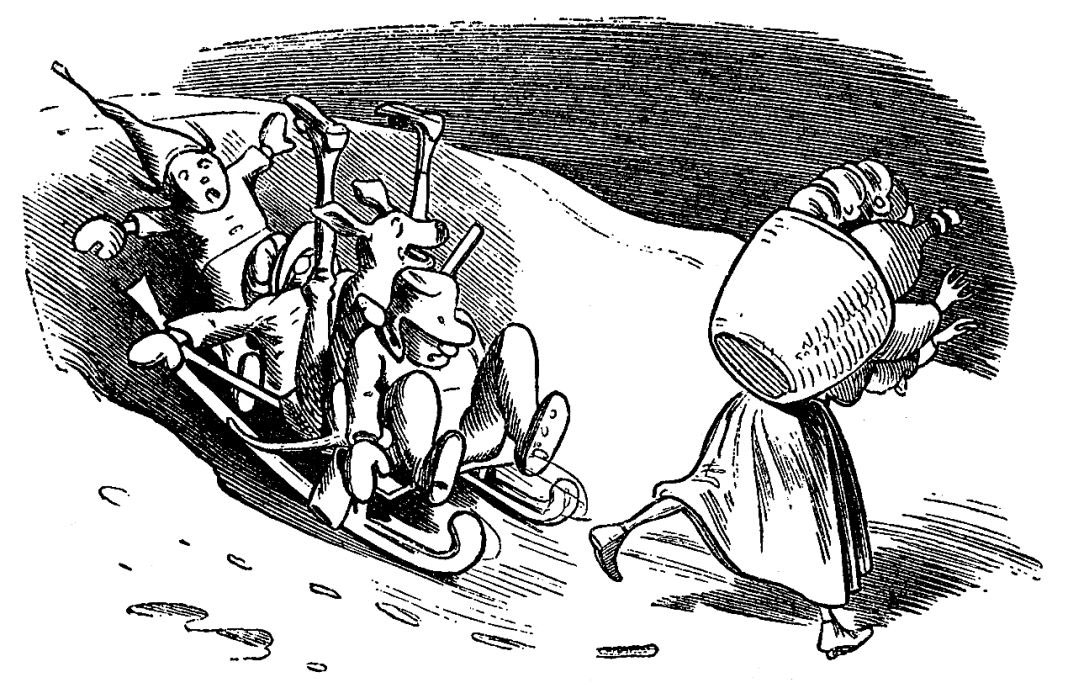 Two mischievous boys want to rob a raven's nest in 'Das Rabennest' ("The Raven's Nest", sheet #308, 1861), but fall from the tree into a puddle, leaving them as black as ravens. Another naughty kid bothering birds appears in 'Der hinterlistige Heinrich' ("Crooked Heinrich", sheet #361, 1864), in which little Heinrich uses a pretzel to capture a little goose, but its parents pick up the brat and drop him in the chimney of his house, where the kid plummets into his mother's cauldron. A monkey gets his revenge on a taunting boy in 'Der Affe und der Schusterjunge' ("The Monkey and the Shoemaker's Boy", sheet #361, 1864). Winter hijinks occur in 'Die Rutschpartie' ("The Downhill Slide", sheet # 370, 1864), where a sledder accidentally kicks over various people on his way down. A gag that has often been repeated in many humor comics since.