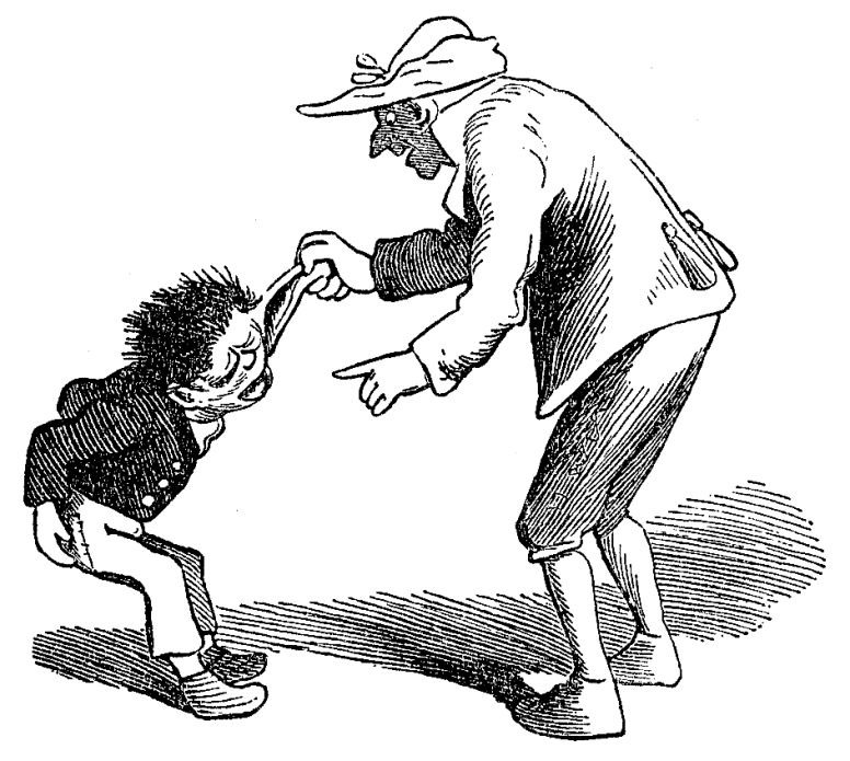 Busch had used a mischievous boy before in picture stories for Fliegende Blätter, such as 'Tandelnswerte Antwort auf eine wohlgemeinte Frage' ("Reprehensible Answer to a Well-Intentioned Question", 1860) and 'Trauriges Resultat einer vernachlässigten Erziehung' ("The Sad Result of a Neglected Education", 1860). The latter tale already introduced a tailor named Böck, similar to the one used in 'Max und Moritz'. A naughty boy can also be found in 'Der hinterlistige Heinrich' ("Crooked Heinrich", 1864) and 'Der Affe und der Schusterjunge' ("The Monkey and the Shoemaker's Boy", 1864) in Münchener Bilderbogen. Similarly, Busch used two boys playing pranks on their environment in 'Die kleine Honigdiebe' ("The Little Honey Thieves", 1859) and 'Das Rabennest' ("The Raven's Nest", 1861), both published in Münchener Bilderbogen, and 'Diogenes und die bösen Buben von Korinth' ("Diogenes and the Mean Kids from Korinthe", 1862) in Fliegende Blätter. Even after 'Max und Moritz', Busch re-used bad little boys in picture stories like 'Das Pusterohr' ("The Beanshooter", Über Land und Meer, 1867), 'Der Wurstdieb' ("The Sausage Thief", Daheim, 1868) and 'Plisch und Plum' (1882).