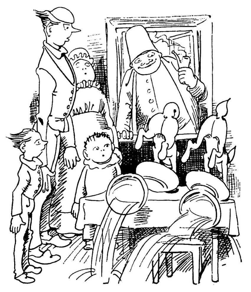The collection contains four separate tales, all presented in text comic format, with text captions underneath the images. 'Hansel und Gretel' is a parody of the famous fairy tale, in which the children get lost in the woods because they hate their mother. The witch turns out to be married to a cannibal. In 1862, Busch had already spoofed this fairy tale, but then as a musical play for composer George Kremplsetzer. In 'Katze und Maus', a cat tries to catch a mouse but only causes a lot of mayhem in the household. In the end, the mice celebrate their victory by dancing in a circle. A moralistic tale is 'Krischan mit der Piepe' , in which a young boy smokes his father's pipe, but predictably turns sick. Busch elevates the "scare 'em straight" factor by letting the nauseous kid see all kinds of frightening hallucinations, making modern-day readers wonder if there was more in that pipe than tobacco alone. The most disturbing story is 'Eispeter'. A boy called Peter goes ice skating, ignoring warnings from adults. He crashes through the ice and gets frozen. At first, the situation looks comical, with his father and uncle taking their little frozen relative home to thaw him. But the heat works a little too well and the poor boy melts away. His remains are then scooped and kept in a weck jar.