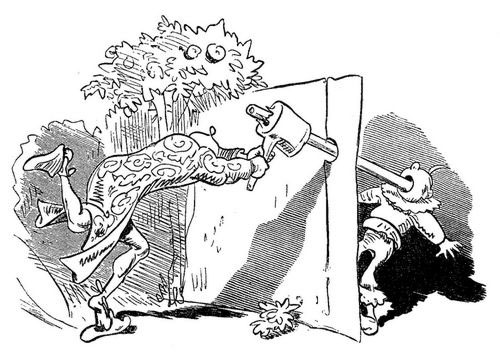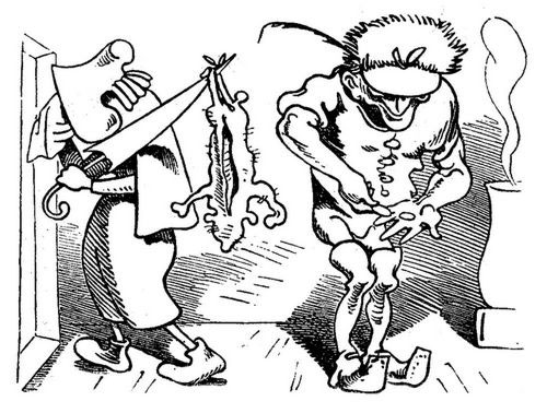 Busch returned to pantomime comedy with 'Das erste Bad im Freien' ("The First Bath Outdoors", issue #832, 1861), in which a man decides to swim in a lake to cool himself off from the hot weather. However, he quickly rushes back ashore, because leeches have attached themselves to his body. More aquatic horror can be found in the text comic 'Der Frosch und die beiden Enten' ("The Frog and the Two Ducks", issue #841, 1861). Two ducks try to catch a frog, but eventually get stuck, becoming easy prey for a butcher. In 'Die Ballade von den sieben Schneidern' ("The Ballad of the Seven Tailors", issue #842, 1861) seven tailors rob a woman, but all die, with the Devil hanging their souls (visualized as threads) to a tree. Whenever one hears the wind whistle, it's actually the tailors' voices. Mankind triumphs in 'Die Fliege' ("The Fly", issue #859, 1861), in which a man tries to capture an annoying fly, eventually crushing the insect flat. In 'Der hohle Zahn' ("The Hollow Teeth", issue #861, 1862), another poor guy is tormented by a toothache, wiggling in pain until a dentist finally pulls the tooth. Man's best friend turns out to be worthless in 'Der zu wachsame Hund' ("The Attentive Dog", issue #869, 1862), where a dog owner gets stuck in a ditch, but his pet prevents him from getting saved.