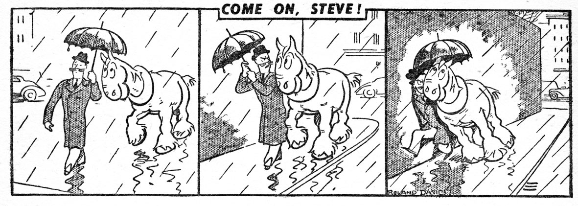 Oddly enough, his first long-running comic strip dealt with a traditional means of transport, namely a horse. On 6 March 1932 the pantomime gag comic 'Come On, Steve!' (occasionally spelled without a comma too, 1932-1949) made its debut in The Sunday Express. All gags centered around an intrusive but essentially good-natured carthorse named Steve. His name was a tribute to famous champion racehorse jockey Steve Donoghue. The comic strip was popular at the time and led to a few annual compilation books and twelve color picture books. In 1939 the Sunday Express dropped 'Come On, Steve!', which motivated the cartoonist to move to a different paper, the Sunday Dispatch, where the antics of good ol' Steve continued until 1949. Davies published political cartoons for this same paper under the pseudonym "Rod".