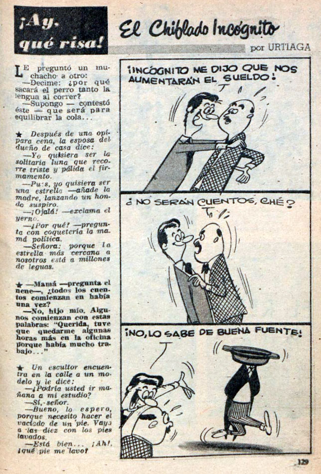 'El Chiflado Incognito' (PBT magazine, 19 November 1954). Translation: "Incognito told me how we can raise our salary!" - "You're not telling me stories, are you, friend?" - "No, he knows it from a good source."