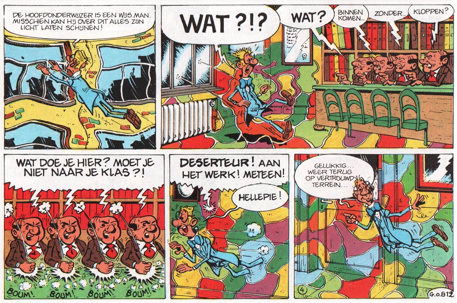 'Génial Olivier' mainly consists of gags and short stories, but also features a couple of serials such as 'Le Passé Recomposé' (1977) and 'L'Électron et le Blason' (1979). 'M. Rectitude et Génial Olivier' was collected by Dupuis in 17 albums. The series was also translated into Dutch as 'Geniale Olivier', sometimes adding Mr. Rectitude in the full title as 'Mr. Kweeniewa en Geniale Olivier'. Devos drew the series until his retirement in 1988. 'Génial Olivier' possibly served as an inspiration for Alan Moore and Kevin Nowlan's similar whizzkid 'Jack B. Quick' (1999-2002).