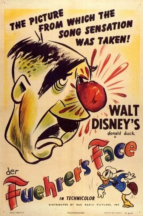 Another reason why 'Pinocchio' and 'Fantasia' didn't do well commercially is that Hollywood pictures were banned in all Axis-occupied countries during World War II. However, the war also gave Disney new sources of income when the United States got involved in the conflict on 7 December 1941. The U.S. government commissioned the studio to produce various propaganda cartoons. Some, like 'Stop That Tank' (1942), 'The Grain That Built a Hemisphere' (1943) and 'Victory Through Air Power' (1943) were instruction films, strictly intended for military audiences. Disney also educated the masses by reminding them of the importance of buying war bonds ('Donald's Decision', 1942), saving precious material ('Out Of The Frying Pan, Into the Firing Line', 1942) and paying income taxes ('The New Spirit', [1942], and 'The Spirit of '43', [1943]). Some cartoons criticized Nazism, such as 'Der Fuehrer's Face' (1942), 'Education for Death' (1943) and 'Reason and Emotion' (1943), while more straightforward entertaining shorts were 'Donald Gets Drafted' (1942), 'The Vanishing Private' (1942), 'Sky Trooper' (1942), 'Fall Out, Fall In' (1943), 'The Old Army Game' (1943) and 'Home Defense' (1943), in which Donald is bullied around in the army by Pete. In 'Commando Duck' (1944), Donald is actually sent to the South East Asian jungle, where he fights the Japanese. While these war-time propaganda cartoons put most of the studio's other productions on hold for two years, they did help the company out of the red.