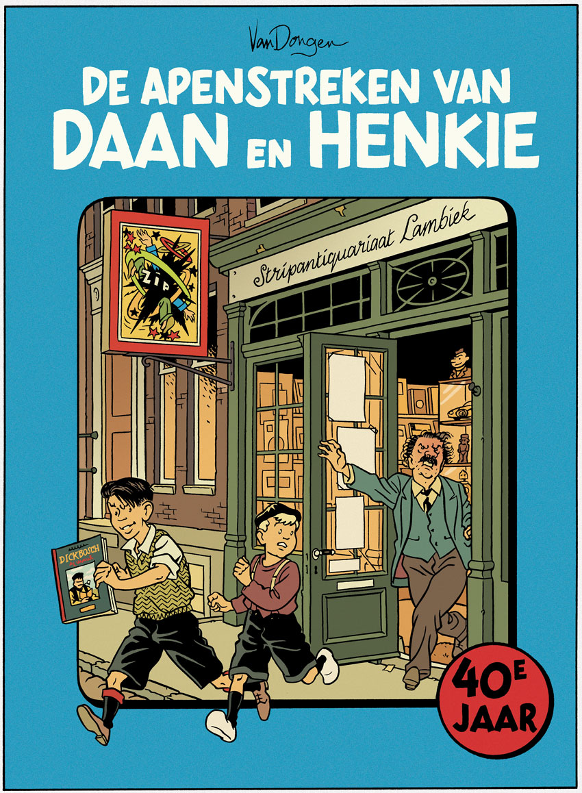 Tribute drawing to celebrate the 40th anniversary of Amsterdam comic store Lambiek in 2008, parodying Hergé's 'Quick & Flupke'. The two boys here are characters from Van Dongen's 'Muizentheater', chased by Lambiek store founder Kees Kousemaker.