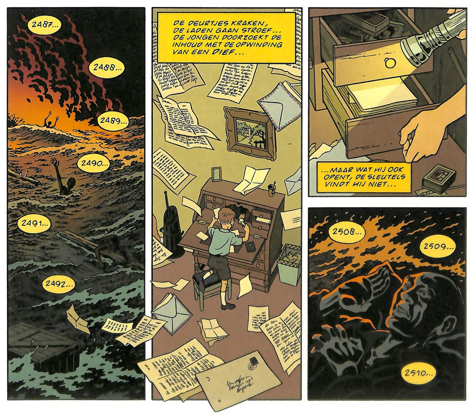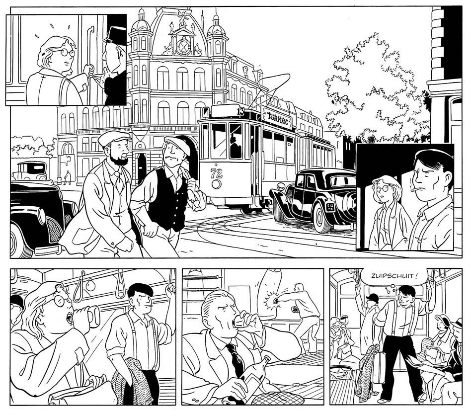In a way, his 'Prince en Buster' strips can be considered finger exercises for Peter van Dongen's breakthrough graphic novel 'Muizentheater' ("Theater of Mice", 1990), which appeared in Dutch in Casterman's "Wordt Vervolgd Roman" collection. Again, the comic starts off in 1930s Amsterdam, but this time, Van Dongen dropped the more dynamic Vleeschouwer influences and settled upon a Clear Line approach in the tradition of Hergé. Over the course of several short stories, 'Muizentheater' tells the coming-of-age of the brothers Daan and Henkie - one rebellious and unpleasant, the other shy and compliant. Starting their story during the Great Depression, the boys live in one of Amsterdam's poor working class neighborhoods, where their father works in the harbor and is always drunk. 'Muizentheater' follows the boys as they get older and grow apart, and finishes just before World War II. The epilogue tells what happens to them during the war. Appearing one year after Lian Ong's 'Stuifmeel' (1989), Van Dongen's debut was heralded as part of a new wave that elevated Dutch comics into adulthood.