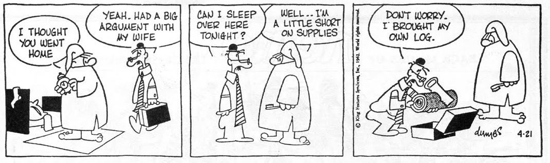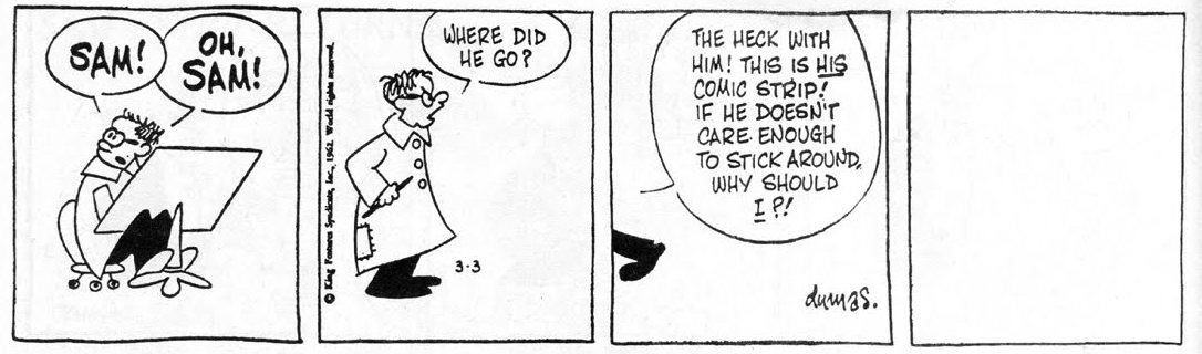 In June 1956, Dumas paid a visit to Mort Walker's studio at the recommendation of a friend and was instantly hired. Initially, Dumas was just a text editor and gag writer for Walker's daily newspaper comics 'Beetle Bailey' (drawn by Walker) and 'Hi and Lois' (drawn by Dik Browne). By the end of the decade he also helped with inking, drawing and lettering 'Beetle Bailey'. When Walker and his assistant Frank B. Johnson launched another gag-a-day comic in 1968, 'Boner's Ark', Dumas co-wrote, co-drew and lettered this series too. Walker and Dumas each wrote ten gags a week, after which they picked out the best ideas for further development. Since they were the only scriptwriters on all these series until deep in the 1960s, a close friendship grew. Their taste in comedy, especially for humorous newspaper comics, was very similar. From this shared passion Dumas' first personal comic series would be born: "Sam's Strip'.