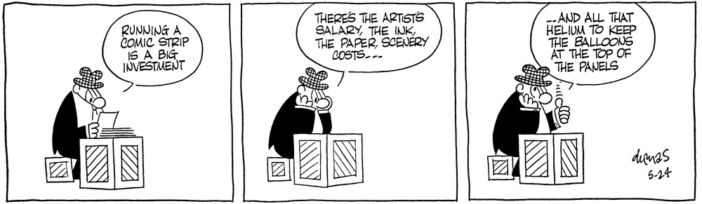 In addition, Dumas has also done scriptwriting for comic strips by other artists, such as 'Rabbits Rafferty' (1977-1981), based on Dumas' own 1968 children's novel of the same name. The only difference was that the original novel was illustrated by Wallace Tripp, while the newspaper text strip version was illustrated by Mel Crawford.