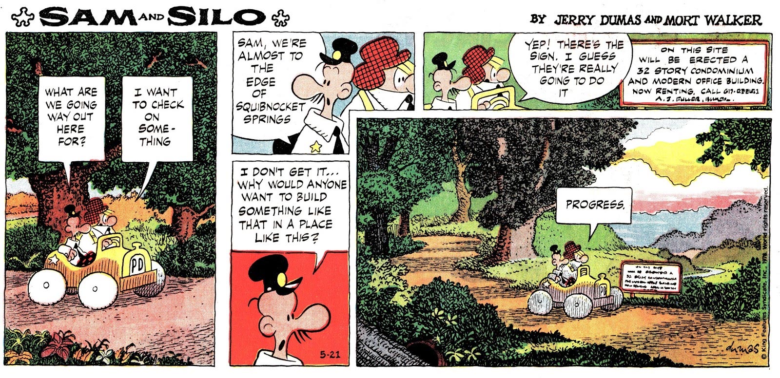 By being less self-reflexive and taking place in a quiet, recognizable U.S. rural town, 'Sam and Silo' disappointed fans of 'Sam's Strip', but nevertheless pleased general audiences enough to last 39 years, up until Dumas' death. Originally, Walker scripted many episodes personally, but after 1995 he retired, leaving the sole control to Dumas himself. The series is notable for Dumas' beautiful rustic backgrounds. He drew picturesque streets and nature landscapes, many inspired by real locations the artist visited in Maine and Martha's Vineyard. Dumas had a particular knack for drawing tree shade on the road. The contrast between the cartoony characters and the elaborate, realistically drawn backgrounds was striking and gave the series its own unique look. Walker said they deliberately added this element to 'Sam and Silo' as a reaction to numerous other newspaper comics where the characters just walk around in simple, dull white voids.