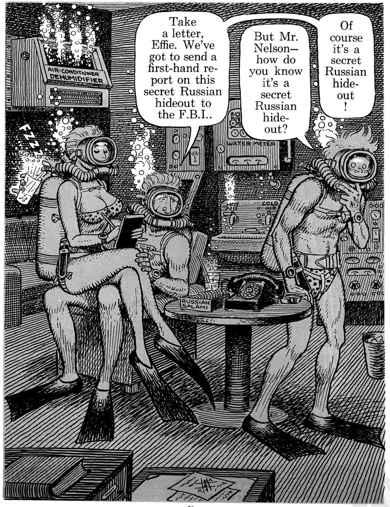In August 1960, Harvey Kurtzman launched yet another satirical magazine, Help!, relying more on photo collage spoofs and fumetti (photo comics) than actual hand-drawn comics. The most notable exception was Kurtzman and Elder's 'Goodman Beaver' feature, which debuted in issue #10 (May 1961). Goodman was a character who originated in Kurtzman's previous graphic novel Jungle Book, but was now recast as a young idealist typically finding himself in an odd location, asking questions about the madness surrounding him. In one episode he goes to Africa, where he confronts Tarzan with his supposed white colonial attitudes towards the natives. In 'Goodman, Underwater' (May 1962), Goodman meets a Don Quixotesque underwater crimefighter who fights invisible enemies. The entire story is done in the style of Gustave Doré's illustrations of Cervantes' famous novel. Other episodes brought Goodman in contact with Marlon Brando and a disillusioned Superman. In 'Goodman Goes Playboy' (issue #13, February 1962), the teenager meets Archie from Archie Comics who has now succumbed to the Playboy style. Archie and his friends turn out to have signed a pact with "the Devil", AKA Hugh Hefner. As many follow their example, Goodman wonders whether he "should leave to find a place where the dark forces aren't closing in... where honor is still sacred and where virtue triumphs?" But he quickly changes his mind: "Maybe I should sign up."