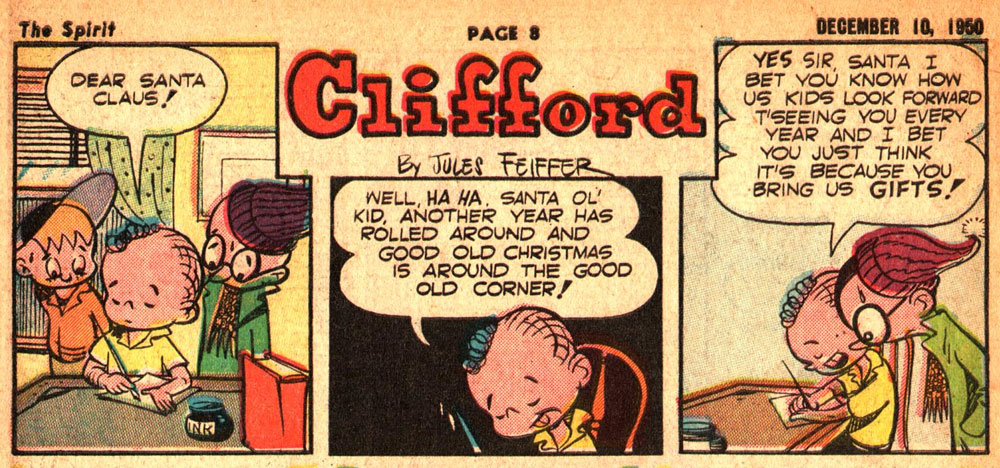 While he was working as a scriptwriter for 'The Spirit', Feiffer once asked Will Eisner for a raise. When his taskmaster refused, Feiffer threatened to quit. As a counter proposal, Eisner offered his assistant the opportunity to create his own comic strip. 'Clifford' (1949-1951), a charming gag series about a little boy and his naïve view of the world, debuted in Eisner's one-shot comic book 'Kewpies' (Spring 1949). For the drawing style, Feiffer tried to imitate Walt Kelly, and in the writing, he aspired to show how children really behave, not how adults want to see them. Between 10 July 1949 and 4 March 1951, 'Clifford' continued in The Spirit Section as a weekly back cover feature. The later episodes of ‘Clifford’ were written by Feiffer and drawn by Gene Bilbrew. Although 'Clifford' didn't leave a lasting mark with readers, it is historically notable for debuting a year before Charles M. Schulz's 'Peanuts' (1950-2000), a comic strip with which it shares thematic similarities. Although it is not known if Schulz had ever read 'Clifford', Will Eisner, in an interview by John Benson for Panels, stated that 'Clifford' was "a great feature that deserves to be recognized as the forerunner of Peanuts." 'Clifford' was Feiffer's first attempt to create comics about real-life people and their worries, a theme that became his trademark.