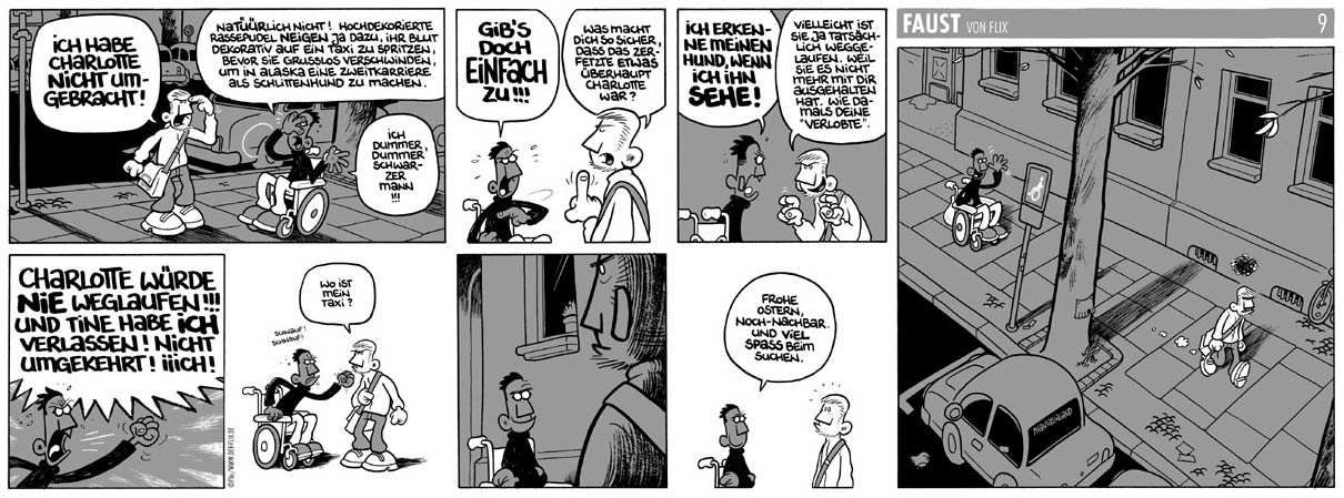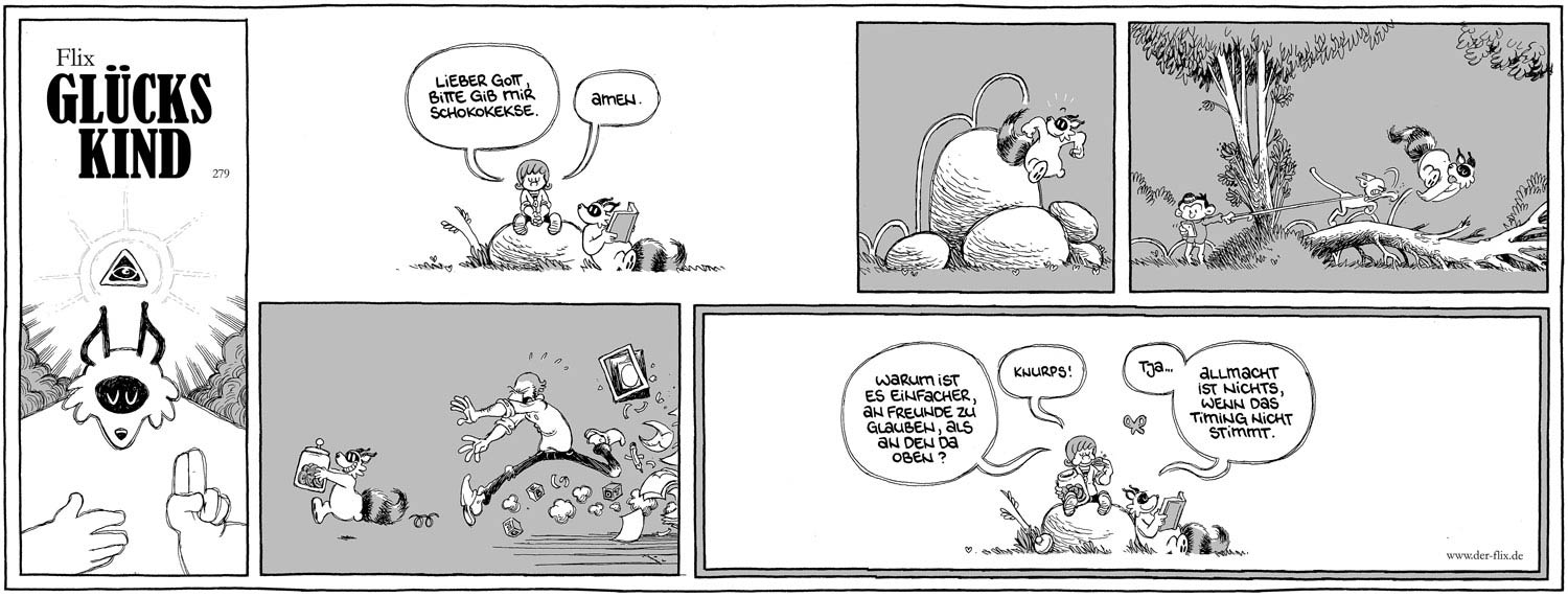 For the Berliner Tageszeitung newspaper, Flix made 'Schöne Töchter' (2010-October 2015), a gentle comic strip about a modern love life, in which the artist experimented freely with panel layouts. It was awarded the 2012 Max & Moritz Prize for "Best Humor Strip". When 'Schöne Töchter' was concluded, Flix launched 'Glückskind' (2015- ) in the Frankfurter Allgemeinen Zeitung. Appearing every Monday, Flix's widely praised heartwarming family humor strip deals with the interactions between mister Glück, his daughter Josi and a three-legged raccoon named Rocco. Book collections of both strips have appeared at Carlsen Verlag.